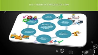 Este documento presenta los 5 niveles de capacidad del modelo CMMI para mejorar los procesos de una organización. Describe cada nivel, desde el nivel 0 incompleto hasta el nivel 5 de optimización, señalando las características y prácticas específicas de cada uno. Adicionalmente, muestra ejemplos de áreas de proceso y su nivel de madurez según CMMI.