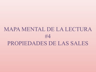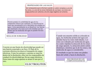 Las sales son compuestos formados cuando un catión reemplaza a un ion o ion hidróxido de una base. Su solubilidad depende de la fuerza de la red cristalina iónica y la habilidad de las moléculas de agua para separar los iones. Las sales solubles conducen electricidad cuando se disuelven en agua debido al movimiento de los iones cargados.