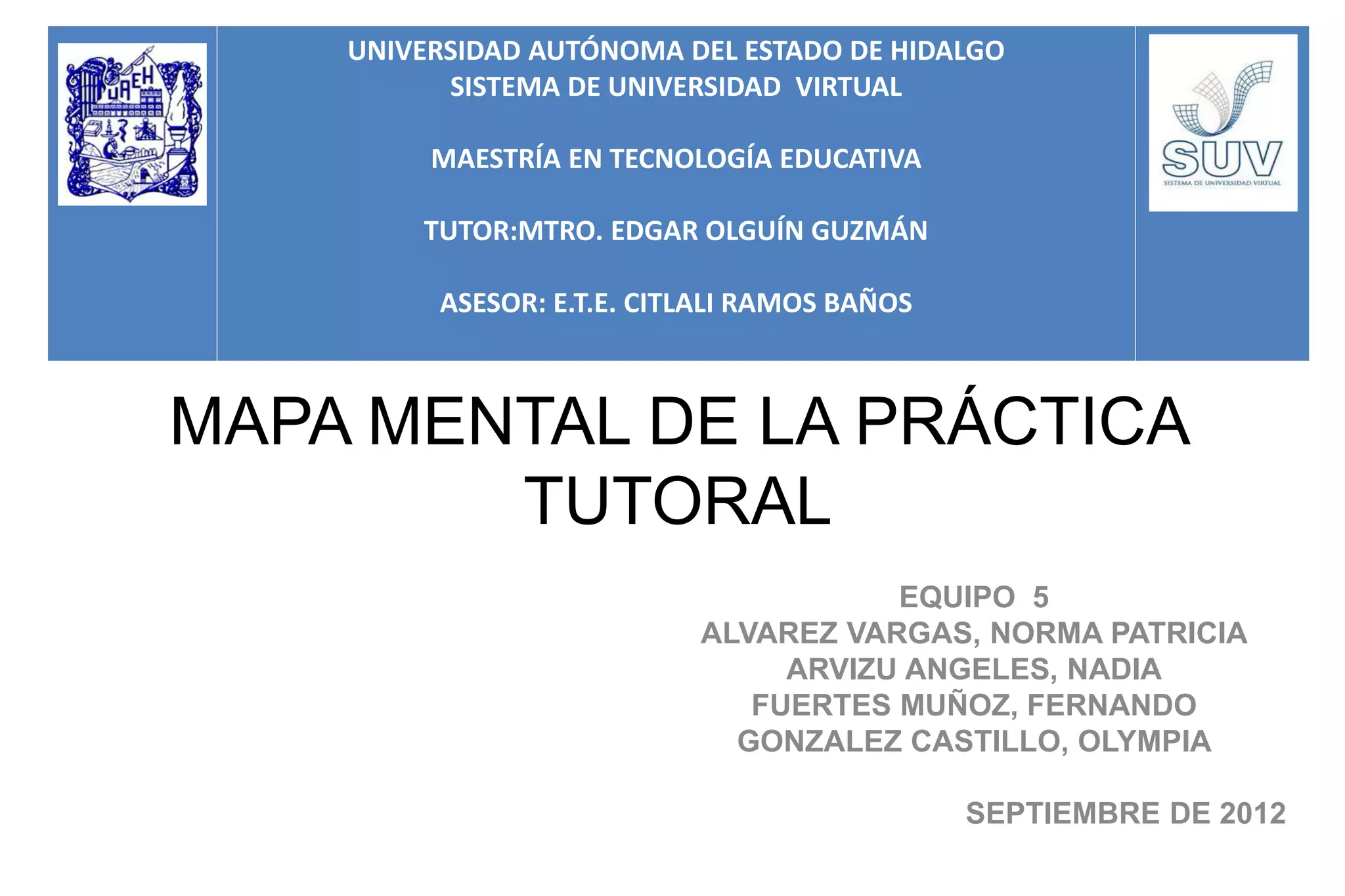 Este documento presenta un mapa mental de la práctica tutorial en una maestría en tecnología educativa de la Universidad Autónoma del Estado de Hidalgo. El mapa fue desarrollado por un equipo de 5 estudiantes y presenta conceptos clave de la práctica tutorial así como dos referencias bibliográficas relacionadas con el tema de la tutoría en educación a distancia.