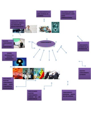 El documento argumenta que el conocimiento es esencial para la mente humana, se deriva de la información y la educación, y que los seres humanos comparten, aplican y adquieren conocimiento a través del desarrollo de competencias y la imaginación para crear nuevas ideas.