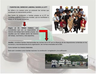 Este documento resume las principales fuentes del derecho laboral según la legislación venezolana. Identifica las fuentes formales como las normas constitucionales, legales y reglamentarias; las fuentes subsidiarias como la costumbre y los usos ajustados a derecho; y las fuentes materiales como los factores históricos y económicos. También explica que la Constitución, la legislación y los convenios colectivos son fuentes importantes, así como los organismos internacionales como la OIT. Finalmente, destaca algunos derechos labor