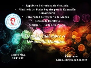 Este documento presenta un mapa mental sobre las etapas del desarrollo humano desde la concepción hasta la adolescencia. Describe las características del periodo prenatal que incluye las etapas zigótica, embrionaria y fetal. Luego resume la etapa de la infancia entre el nacimiento y los 6 años y la etapa de la niñez entre los 6 y 12 años. Finalmente, explica la etapa adolescente entre los 12 a 20 años que se caracteriza por el descubrimiento del yo y el mundo.