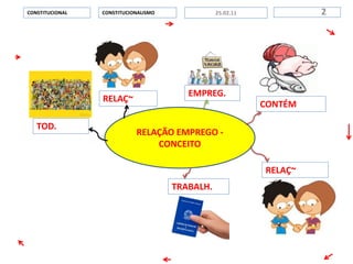 Este documento resume varios conceptos y regulaciones clave del derecho laboral brasileño. Explica conceptos como relación de empleo, empleado, contratos de trabajo, jornada laboral, adicionales, estabilidad laboral, licencias, entre otros. También describe los requisitos y características de estos temas, así como los valores de los adicionales permitidos por ley. Finalmente, agradece a los creadores e ideadores del documento.