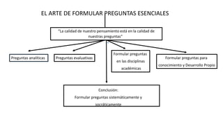 Este documento describe la importancia de formular preguntas sistemáticamente y de manera socrática. Explica que las preguntas pueden ser analíticas, evaluativas o enfocadas en las disciplinas académicas y en el desarrollo personal. Concluye que formular preguntas basadas en el contenido, suposiciones, implicaciones y otros elementos del pensamiento, usando criterios como claridad y relevancia, puede llevar a un pensamiento más disciplinado.