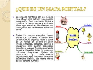 Los mapas mentales son un método efectivo para organizar y memorizar información mediante diagramas radiales con palabras, imágenes y colores. Permiten convertir listas de datos en organizaciones visuales que funcionan como el cerebro humano al clasificar ideas de forma lógica. Sirven para estudiar, organizar información, tomar decisiones y escribir. Sus elementos fundamentales incluyen una idea central, categorías jerarquizadas de ideas secundarias y el uso de colores para transmitir el mensaje de manera eficiente.