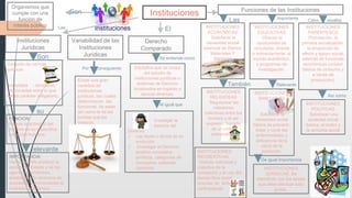 El documento describe las instituciones jurídicas como conjuntos de normas jurídicas complejas y duraderas que regulan la actividad humana y tienen carácter obligatorio. Explica que existen diversas instituciones como las educativas, de parentesco, sanitarias, políticas, económicas, religiosas y recreativas, las cuales cumplen funciones sociales importantes. Además, señala que el derecho comparado estudia instituciones y sistemas jurídicos en diferentes lugares y épocas, e identifica a las instituciones jur