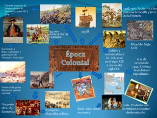 El documento aborda la evolución socio, política y económica de Venezuela durante la guerra de independencia (1811-1823) y destaca aspectos históricos desde 1498 hasta el siglo XIX, como la importancia del cacao y el café en la economía. Se menciona el descubrimiento de América en 1492 y el desarrollo del comercio en el puerto de La Guaira. Además, se incluye la influencia de figuras como José Solano y Bote en la gobernanza colonial.