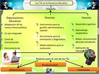 El documento describe el impacto de las tecnologías de la información y la comunicación (TIC) en la gerencia educativa. Las TIC ayudan a las organizaciones educativas a adaptarse a nuevas políticas, sirven como un eje integrador y canal de comunicación, e incrementan la productividad. Los directivos pueden usar las TIC como una herramienta para la administración, orientación, diagnóstico y evaluación. Las TIC también apoyan el desarrollo cognitivo de los estudiantes, el aprendizaje cooperativo, y permiten una mejor comunicación