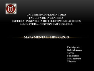 El documento presenta un mapa mental sobre el liderazgo que incluye diferentes teorías del liderazgo como el liderazgo situacional, aprendido y los estilos de liderazgo, así como conceptos como el líder como visionario de decisiones, motivador e integrador. El mapa mental fue creado por Gabriel Aaron Torres para la asignatura de Gestión Empresarial de la Escuela de Ingeniería de Telecomunicaciones de la Universidad Fermín Toro.