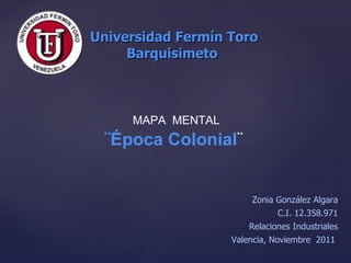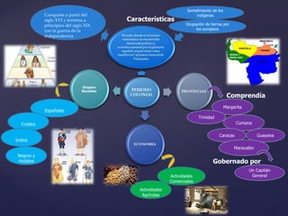 El documento describe la época colonial en Venezuela desde el siglo XVI hasta principios del siglo XIX. Durante este período, los europeos conquistaron el territorio, sometieron a los indígenas y ocuparon sus tierras para actividades agrícolas y comerciales. La época colonial comprendía un capitán general y estaba gobernada por españoles y criollos.