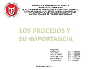 Este documento presenta un proyecto de investigación realizado por 5 estudiantes de la Universidad Fermín Toro en Venezuela para su carrera de Licenciatura en Relaciones Industriales. El proyecto analiza procesos de trabajo y fue realizado como parte de la materia Análisis de Procesos de Trabajo. El documento incluye los nombres y números de cédula de identidad de los 5 integrantes del equipo de estudiantes.