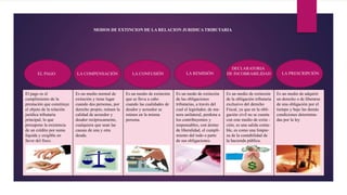Este documento describe los diferentes modos de extinción de la relación jurídica tributaria en Venezuela, incluyendo el pago, la compensación, la confusión, la remisión, la declaratoria de incobrabilidad y la prescripción. Explica las funciones y efectos de cada modo, así como sus procedimientos legales correspondientes según el Código Orgánico Tributario de Venezuela.