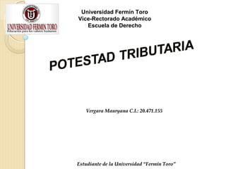 La potestad tributaria puede ser originaria u originada. La potestad tributaria originaria emana directamente de la Constitución y le permite al Estado crear tributos. La potestad tributaria derivada o delegada permite a entidades como municipios o estados crear tributos mediante leyes que derivan de principios constitucionales.