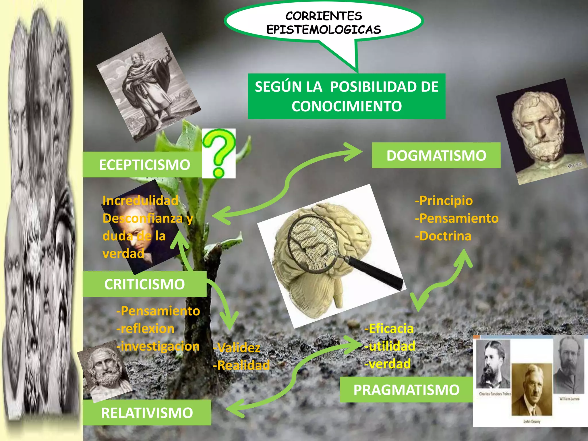 Este documento presenta diferentes corrientes epistemológicas clasificadas en tres categorías: 1) Según la posibilidad de conocimiento: dogmatismo, escepticismo y relativismo; 2) Según el origen del conocimiento: intelectualismo, racionalismo y empirismo; 3) Según la esencia del conocimiento: objetivismo, subjetivismo, realismo, idealismo y fenomenalismo. Cada corriente se define brevemente.