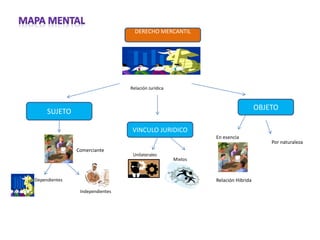 El documento presenta un mapa mental sobre la relación jurídica en Derecho Mercantil. Divide la relación jurídica en sujeto, vínculo jurídico y objeto. El sujeto puede ser comerciante, dependiente o independiente. El vínculo jurídico puede ser unilateral o mixto. Y el objeto es la esencia de la relación por naturaleza o una relación híbrida. Finalmente, incluye una referencia bibliográfica sobre Derecho Mercantil.