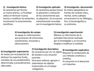 La investigación científica se caracteriza por ser un procedimiento sistemático y metódico que aplica el método científico para obtener información relevante y confiable con el fin de entender y aplicar el conocimiento. Se clasifica en básica, aplicada, documental, de campo, experimental, exploratoria, descriptiva y explicativa.