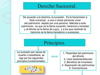 Este documento resume los principios fundamentales del derecho sucesoral en Venezuela. Explica que la sucesión es la transmisión del patrimonio de una persona fallecida a sus herederos. Cubre conceptos como la titularidad del patrimonio del difunto, el momento de apertura de la sucesión, la delación y adquisición de la herencia, y los principios de continuidad del causante y unidad de la herencia. También describe las características de las normas del derecho sucesoral venezolano, resaltando el rol de la voluntad de las