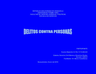 Este documento proporciona información sobre un estudiante de la Universidad Fermín Toro en Venezuela. Se detalla que Alejandro Suarez, con identificación V-15.448.224, está cursando la asignatura de Derecho Civil Bienes y Derechos Reales en la sección SAIA-D con el profesor Marco Castellanos en enero de 2016.