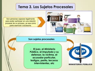 El documento habla sobre temas 3 y 4 de derecho procesal penal. El tema 3 trata sobre los sujetos procesales como el imputado, la víctima, el Ministerio Público, el juez y sus roles. El tema 4 trata sobre la jurisdicción y competencia de los tribunales, incluyendo la jurisdicción ordinaria, la competencia territorial y por materia.