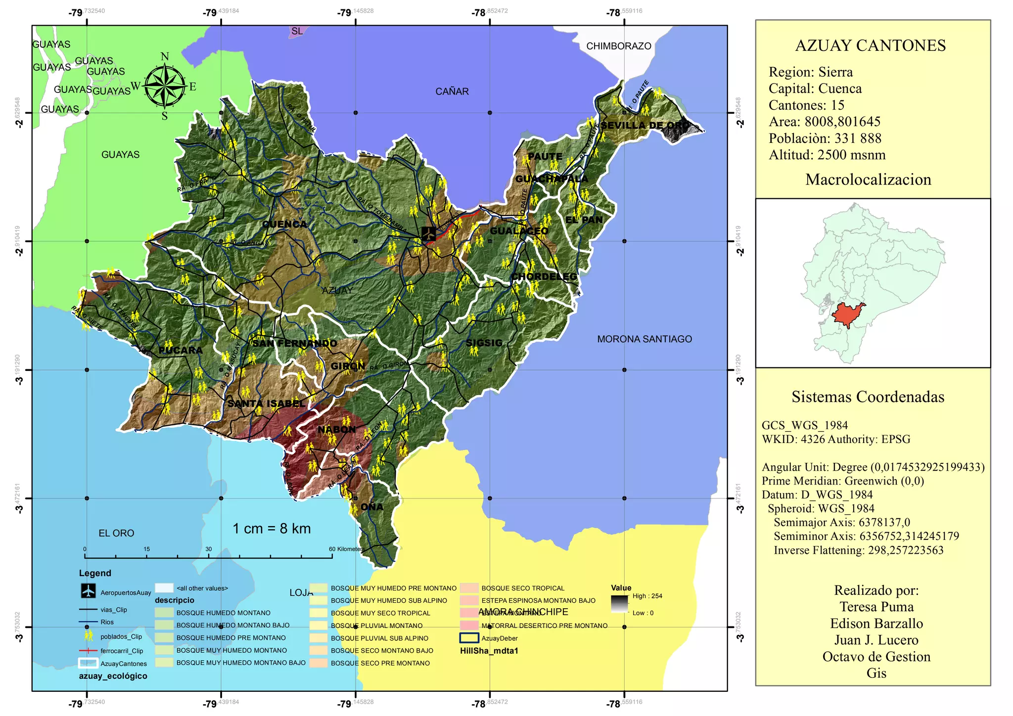 El documento presenta información geográfica sobre la provincia de Azuay en Ecuador, incluyendo sus cantones, coordenadas y características climáticas. Se detallan aspectos como la altitud promedio, población y la distribución de diferentes tipos de bosques. Además, se menciona que fue elaborado por Teresa Puma, Edison Barzallo y Juan J. Lucero en el contexto de gestión GIS.