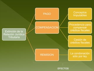Este documento resume los medios de extinción de la relación jurídica tributaria como el pago, la compensación, la remisión y la condonación. Explica conceptos como créditos fiscales imputables y la procedencia para compensar créditos fiscales. Finalmente, cita varias fuentes en línea sobre estos temas tributarios.
