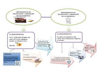El documento describe el procedimiento de tramitación y aprobación de enmiendas y reformas a la constitución. Existen tres formas en que puede partir el procedimiento: 1) que lo proponga el 15% de los ciudadanos inscritos en el registro civil y electoral, 2) que lo proponga el 30% de los integrantes de la Asamblea Nacional, o 3) que lo proponga el Presidente de la República en Consejo de Ministros. La aprobación requiere la mayoría de votos de los integrantes de la Asamblea Nacional así como la presencia de otros entes pertinentes