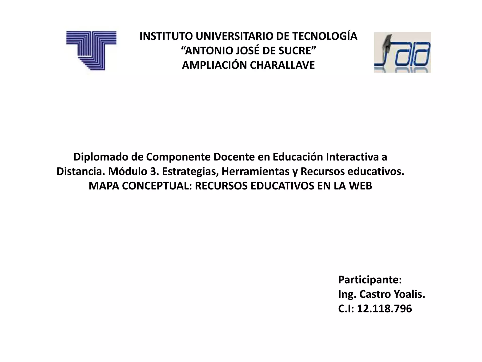 El documento presenta un mapa conceptual sobre recursos educativos en la web desarrollado por el Ing. Castro Yoalis como parte del módulo 3 del Diplomado de Componente Docente en Educación Interactiva a Distancia del Instituto Universitario de Tecnología "Antonio José de Sucre" en la ciudad de Charallave.