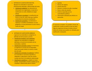 Este documento describe diferentes formas de clasificar información, incluyendo sistemas de clasificación exactos como la clasificación alfabética, cronológica y geográfica, y sistemas de clasificación ambiguos como la clasificación temática, orientada a tareas y orientada a la audiencia. La clasificación de la información es importante para organizarla de manera lógica y extraer valor de ella cuando se genera un reporte o producto.