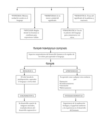 El documento trata sobre el desarrollo del lenguaje y la cognición. Explica que el lenguaje se desarrolla principalmente en el hemisferio izquierdo del cerebro y sigue una secuencia establecida en todos los niños del mundo, comenzando con balbuceos y llegando a oraciones completas. También describe los diferentes tipos de lenguaje y las teorías sobre cómo se aprende el lenguaje, incluyendo la imitación, el condicionamiento y la interacción.