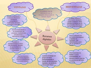 Este documento define recursos digitales y herramientas digitales, y discute sus ventajas y desventajas. Los recursos digitales son cualquier información almacenada en formato digital, y motivan el aprendizaje al ofrecer presentaciones multimedia e interactivas. Las herramientas digitales incluyen software y programas. Algunas ventajas son que facilitan el aprendizaje autónomo y el acceso a la información, mientras que las desventajas pueden incluir la pérdida de tiempo buscando información, la necesidad de alfabetización