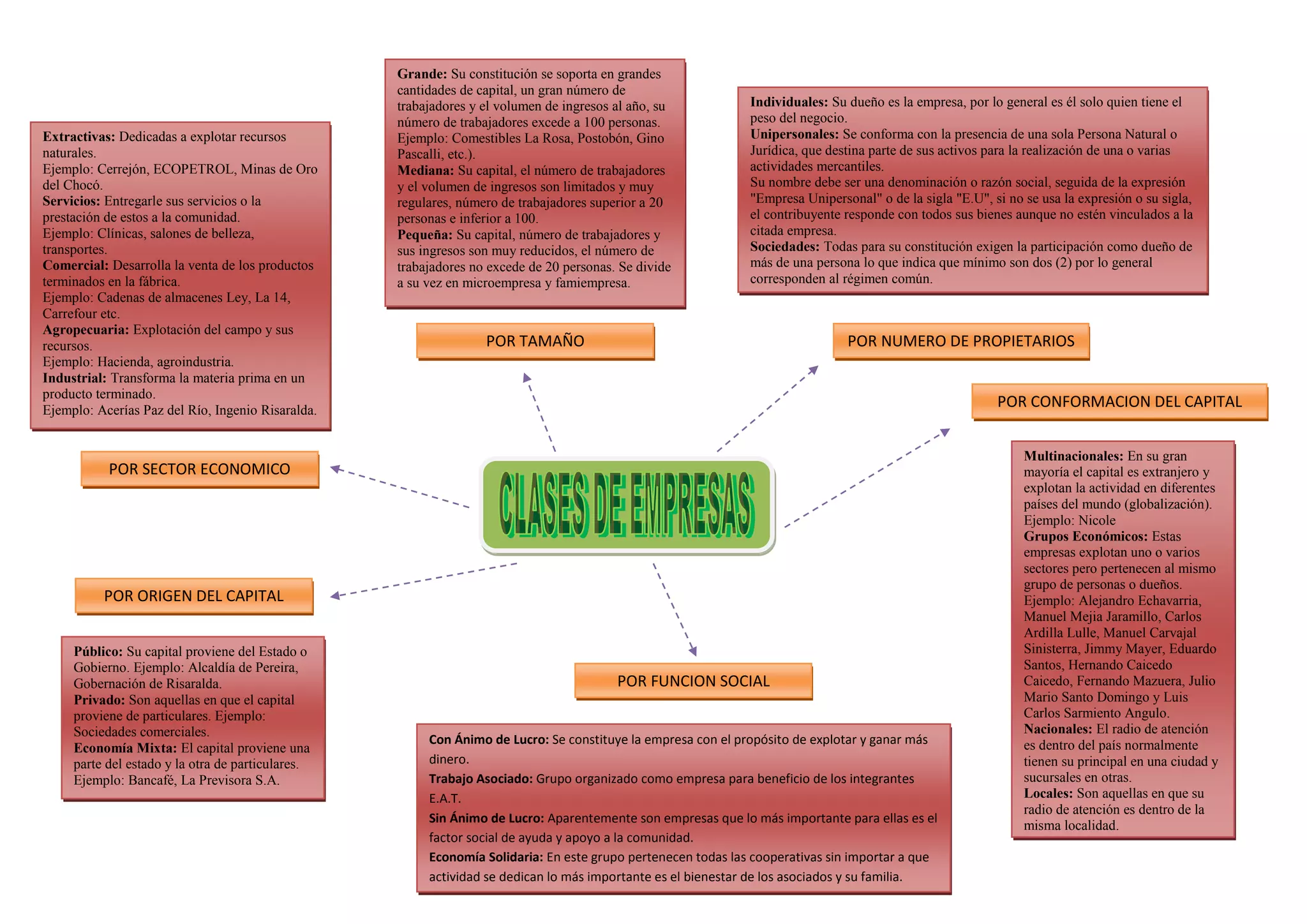 Existen diferentes tipos de empresas según su constitución legal y estructura organizacional. Las empresas pueden ser unipersonales, constituidas por una sola persona; sociedades, constituidas por dos o más personas; y varían en tamaño desde grandes hasta pequeñas dependiendo de su capital, trabajadores e ingresos. También se clasifican según su sector como extractivas, de servicios, comerciales, agropecuarias e industriales.