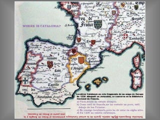 El documento presenta un extracto de un mapa de Europa de 1235 que se conserva en la Biblioteca Nacional de Francia. Muestra el mapa político de Europa en ese año e invita al lector a buscar dónde está representado Cataluña en el mapa. Al pie del mapa, en rojo, se indica que Cataluña está representada en la parte inferior.