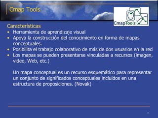 CmapTools es una herramienta de aprendizaje visual que permite la construcción colaborativa de mapas conceptuales en red. Los mapas conceptuales representan significados conceptuales y sus relaciones mediante conceptos, proposiciones y conexiones. CmapTools provee un entorno con tres ventanas para crear, agregar recursos y modificar estilos de los mapas conceptuales.