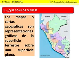 Los mapas son representaciones gráficas de la superficie terrestre sobre una superficie plana. Se pueden clasificar según su contenido, como mapas físicos, políticos, hidrográficos o demográficos. Los elementos clave de un mapa incluyen el título, la leyenda, la orientación y la escala. Los mapas utilizan símbolos para representar características geográficas.