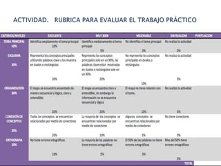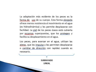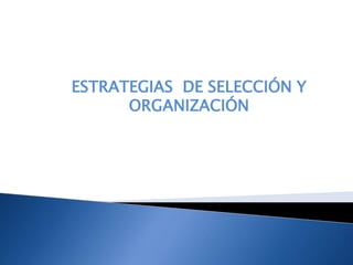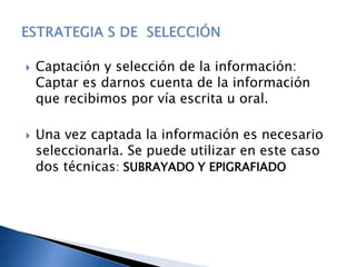 Las estrategias de selección y organización de la información incluyen la captación y selección de la información a través de técnicas como el subrayado y el epigrafiado. El subrayado involucra destacar las ideas claves y diferenciarlas de las ideas secundarias mediante símbolos. Los mapas conceptuales son herramientas gráficas que organizan el conocimiento mostrando las relaciones entre las ideas principales de manera simple y visual.