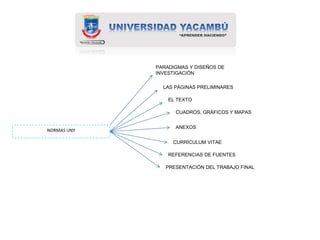 El documento presenta información sobre las normas para la elaboración de un trabajo de grado en la Universidad Yacambu. Explica la estructura general que debe seguir un trabajo de grado, incluyendo la portada, índice, introducción, marco teórico, método, análisis de resultados, conclusiones y referencias. También describe los diferentes signos de puntuación y su uso correcto en la composición de textos.