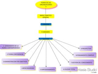 Este documento presenta un mapa temático de 9 unidades de la teoría de las organizaciones. Las unidades incluyen: 1) surgimiento de la teoría contemporánea, 2) teoría contingencial, 3) administración por objetivos, 4) benchmarking, 5) empoderamiento, 6) calidad total, 7) gestión del conocimiento, 8) pensamiento complejo y 9) prospectiva. Además, se mencionan conceptos sobre la educación y mapas conceptuales.