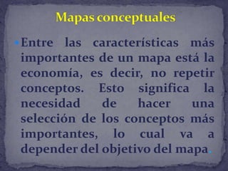 Los mapas conceptuales son representaciones gráficas que muestran cómo está organizado el conocimiento. Deben ser concisos, simples y vistosos para llamar la atención y ser fáciles de comprender. Los conceptos se representan con óvalos y las relaciones con líneas y flechas; también se pueden usar colores, imágenes y números. Existen estructuras vertical y horizontal para organizar jerárquicamente los conceptos por nivel de generalidad y ubicar atributos y características. Además de relaciones jerárquicas, los mapas pued