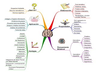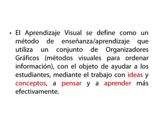 Los organizadores gráficos son métodos visuales para organizar información que ayudan a los estudiantes a pensar y aprender de manera más efectiva. Ejemplos incluyen mapas conceptuales, diagramas de causa y efecto, y líneas de tiempo. Estos permiten identificar ideas erróneas y visualizar patrones e interrelaciones en la información para una mejor comprensión. La elaboración de diagramas visuales también ayuda a los estudiantes a procesar, organizar, retener y recordar nueva información.