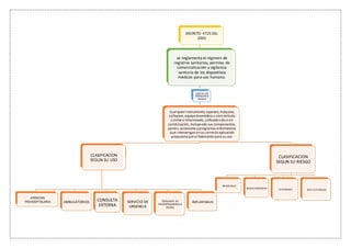 El decreto 4725 de 2005 reglamenta el registro sanitario, permisos de comercialización y vigilancia de dispositivos médicos para uso humano en Colombia. Un dispositivo médico se define como cualquier instrumento, aparato, software o equipo utilizado solo o en combinación para uso médico, incluyendo componentes, partes y programas. Los dispositivos médicos se clasifican según su uso como de atención prehospitalaria, ambulatoria, consulta externa, servicios de urgencia o traslado de pacientes, e implantes, y según su ries