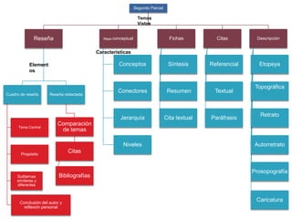 Este documento presenta una lista de temas vistos en el segundo parcial, incluyendo reseñas, mapas conceptuales, fichas, citas, descripciones y diferentes tipos de análisis textual como cuadros de reseña, comparación de temas, niveles jerárquicos, citas textuales y paráfrasis. También cubre temas como narración, argumento, explicación, interpretación, traducción y análisis de hechos reales e imaginarios en los textos.