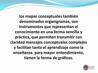 Los mapas conceptuales representan el conocimiento de forma sencilla y práctica para transmitir mensajes conceptuales complejos y facilitar el aprendizaje y la enseñanza. Se construyen identificando conceptos, palabras de enlace y proposiciones, y estableciendo relaciones jerárquicas entre ellos mediante símbolos gráficos.