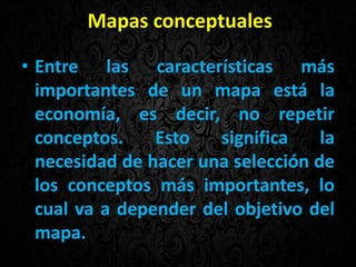 El documento describe los mapas conceptuales, incluyendo sus características principales como la economía y el impacto visual. Explica que los conceptos se representan con óvalos y las relaciones con líneas y flechas. También describe las estructuras vertical y horizontal, así como diferentes tipos de relaciones entre conceptos como secuenciales, causales y comparativas. Incluye ejemplos ilustrativos de cada tipo.
