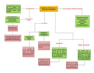 El documento describe los cambios físicos, cognitivos y psicosociales que ocurren en la edad adulta intermedia. Algunos de los principales cambios incluyen la disminución de la visión, audición, gusto y olfato; la pérdida gradual de fuerza y coordinación; y un mayor riesgo de osteoporosis. A nivel cognitivo, la inteligencia cristalizada se mantiene mientras que la fluida disminuye, y la memoria a corto plazo se ve afectada. Psicosocialmente, esta etapa se cent