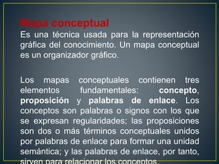 Un mapa conceptual es una técnica gráfica para representar conocimiento que contiene conceptos, proposiciones y palabras de enlace. Los conceptos expresan regularidades, las proposiciones unen dos o más conceptos con palabras de enlace para crear unidades semánticas, y las palabras de enlace relacionan los conceptos.