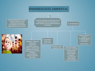 Este documento trata sobre varios temas relacionados con la salud ocupacional. Explica que la epidemiología ambiental estudia la frecuencia de enfermedades y sus determinantes en la población, y que la epidemiología laboral analiza la distribución de enfermedades que pueden estar relacionadas con el trabajo. Además, destaca la importancia de los servicios de salud ocupacional, que se encargan de promover ambientes de trabajo seguros y saludables. Por último, define el riesgo como la vulnerabilidad ante un posible daño, y explic