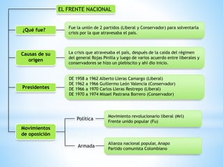 El Frente Nacional fue la unión de los partidos Liberal y Conservador entre 1958 y 1974 para solventar la crisis política en Colombia. Los gobiernos posteriores al Frente Nacional prepararon al país para asumir el poder a través de elecciones democráticas. Más recientemente, los gobiernos de proceso de paz buscaron poner fin a las guerras a través de acuerdos de paz con grupos armados como las FARC.