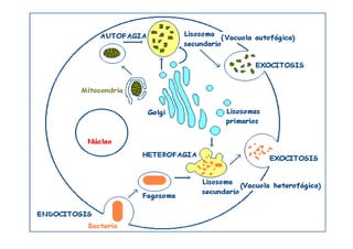El documento describe las características y funciones del retículo endoplasmático liso y rugoso. El retículo endoplasmático liso almacena calcio y participa en la síntesis de colesterol y hormonas, mientras que el retículo endoplasmático rugoso contiene ribosomas y se encarga de la síntesis de proteínas.