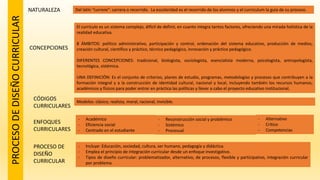 Este documento describe los conceptos fundamentales relacionados con el currículo educativo, incluyendo su naturaleza, elementos, tipos, fundamentos y proceso de diseño. Define el currículo como el conjunto de criterios, planes de estudio y recursos que contribuyen a la formación integral de los estudiantes. Explica que el currículo se basa en teorías pedagógicas, psicológicas y sociológicas, y que debe ser un proceso colaborativo, flexible y pertinente al entorno social.