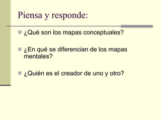 Los mapas conceptuales son una técnica de aprendizaje creada por Joseph Novak en los años 1970 para representar la estructura mental de conocimientos de forma jerarquizada y relacionada. Se componen de conceptos unidos por palabras de enlace para formar proposiciones, y permiten al aprendiz establecer nuevas relaciones conceptuales y mejorar la comprensión.